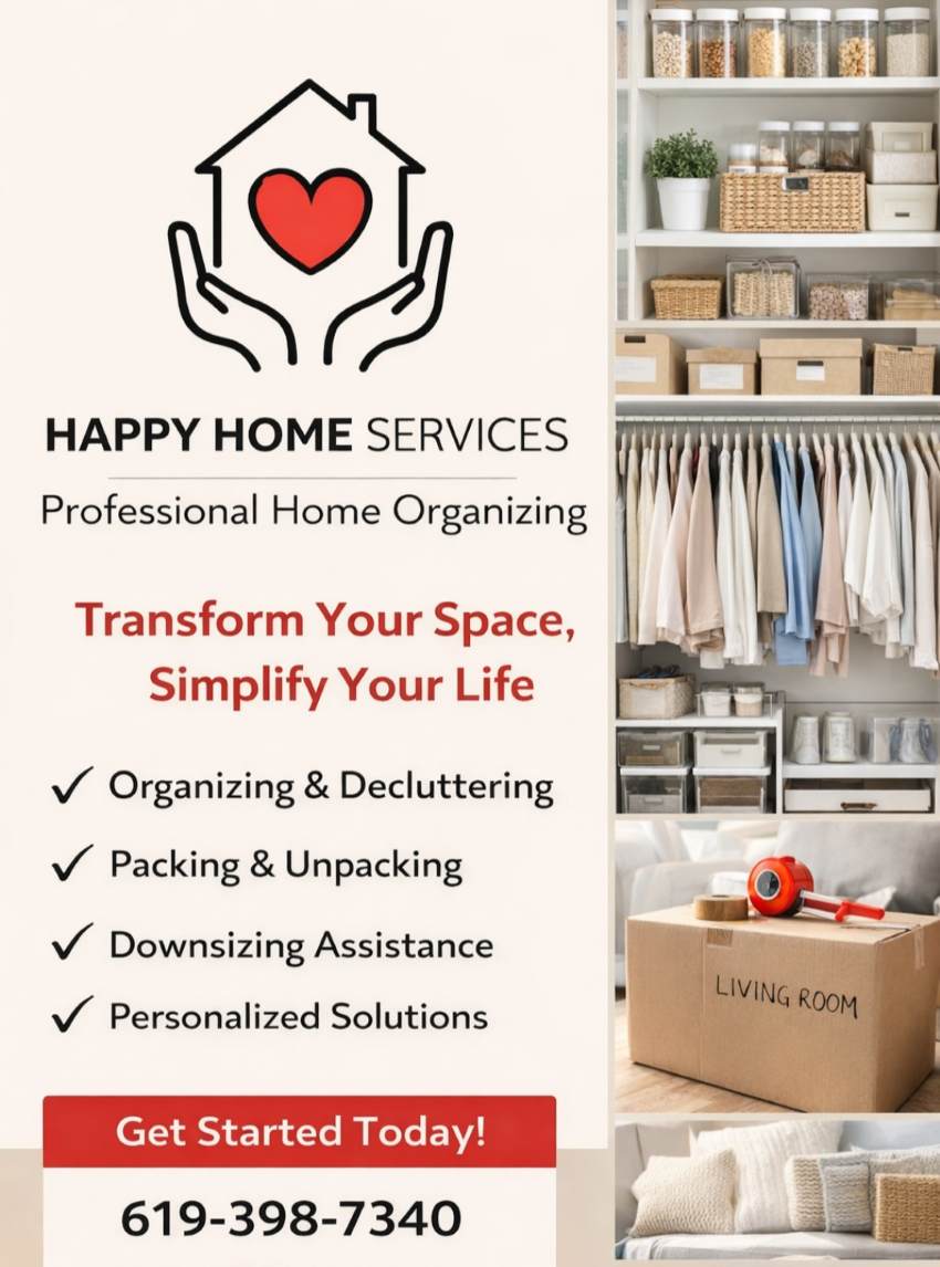 At Happy Home Services, we specialize in helping clients reclaim their spaces through expert organizing, decluttering, and downsizing. Our comprehensive services include packing and unpacking for moves, removal and hauling of unwanted items or junk, estate sales coordination, and much more. We approach every project with kindness, compassion, and a friendly, non-judgmental attitude, ensuring a stress-free experience tailored to your needs.