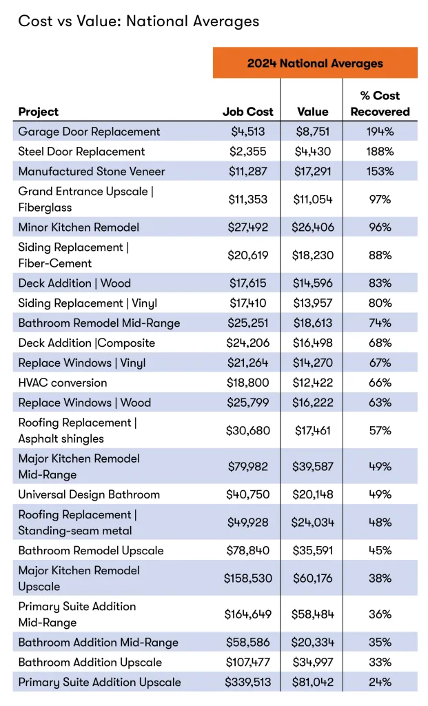 National averages from the Remodeling 2024 Cost vs. Value Report, showing project costs, resale values, and ROI percentages.