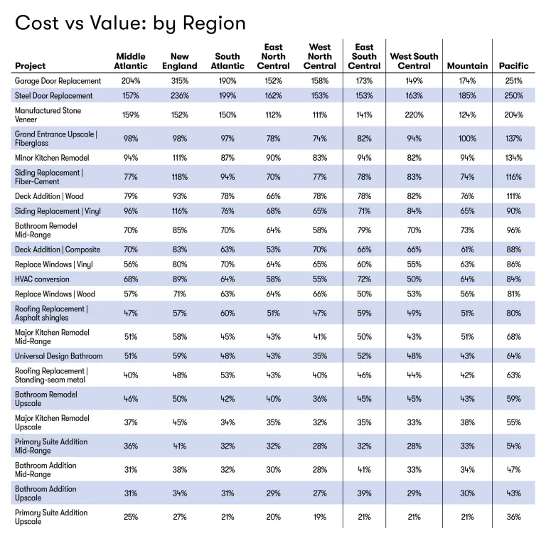 The value of your remodeling investment also depends on location. The Pacific region leads the nation in ROI, with New England close behind. Meanwhile, areas like the East South Central and East North Central regions delivered the lowest average returns on improvement projects.