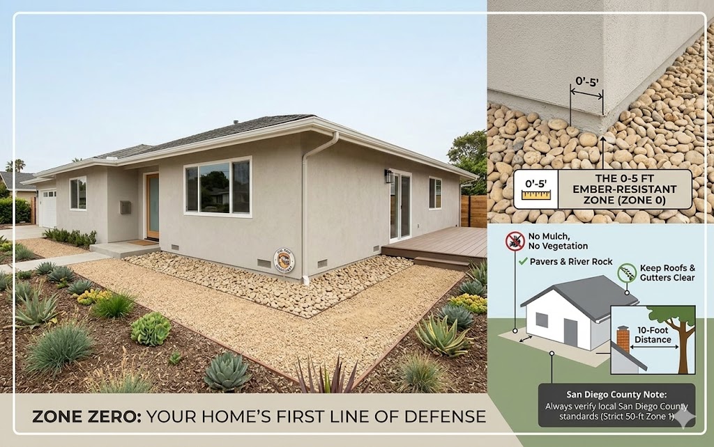 Zone Zero, also known as the Ember-Resistant Zone, is the first 5 feet immediately surrounding your home and any attached structures. The regulation requires removing combustible materials like wood mulch, bark, and most vegetation to prevent wind-blown embers from igniting the home.